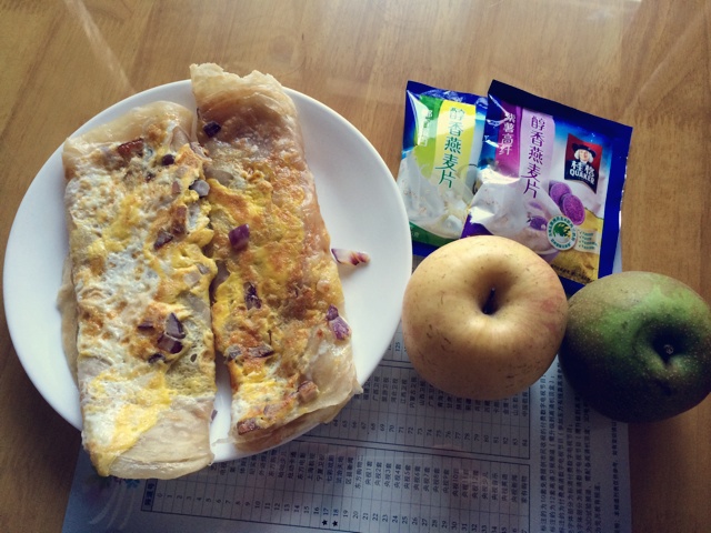 鸡蛋飞饼,燕麦片,苹果生梨