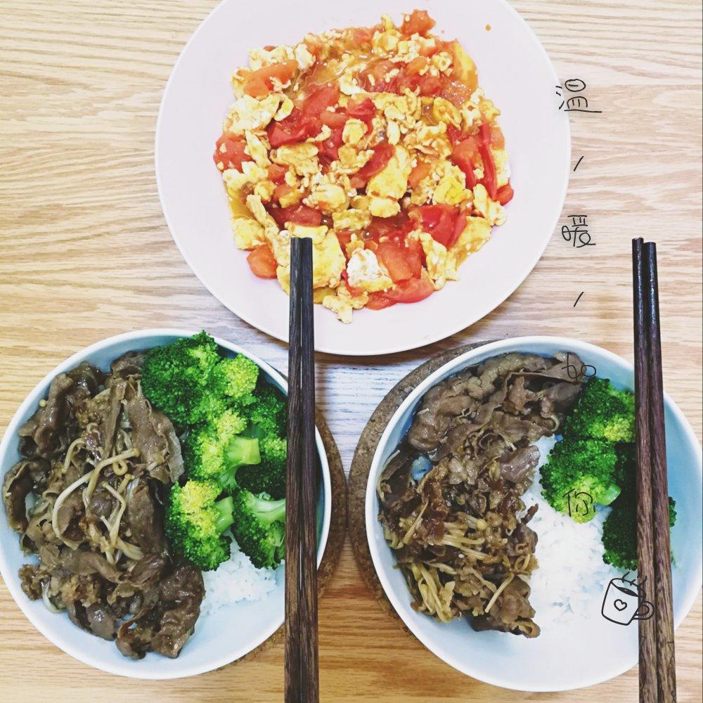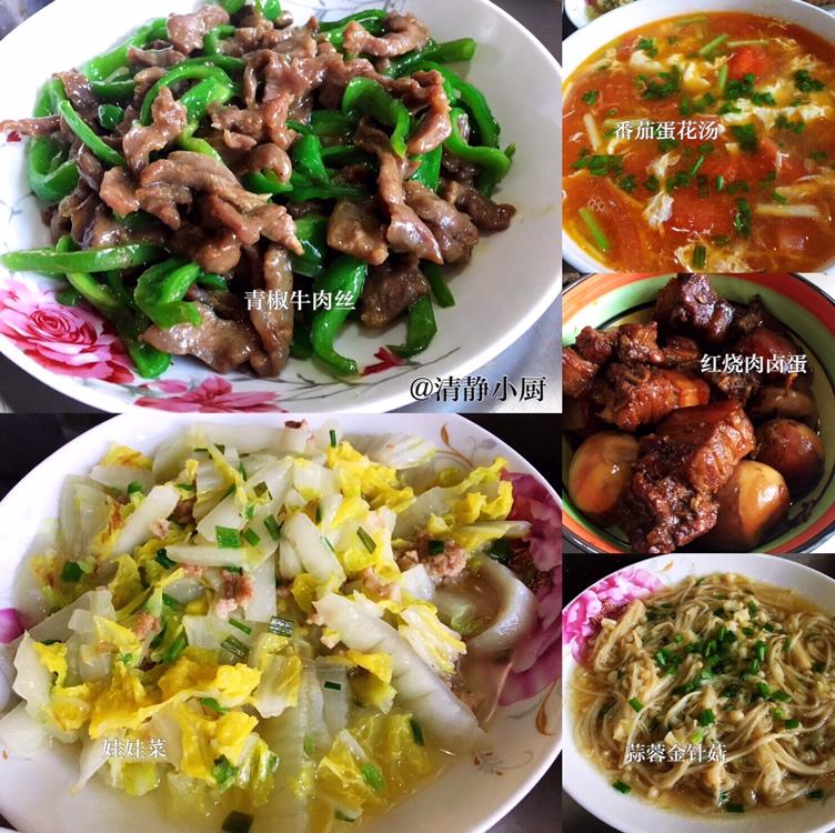 今日晚食:青椒牛肉、娃娃菜、蒜蓉金针菇、红烧肉卤蛋、虾仁炒蛋、酒香草头、番茄蛋花汤、三色...