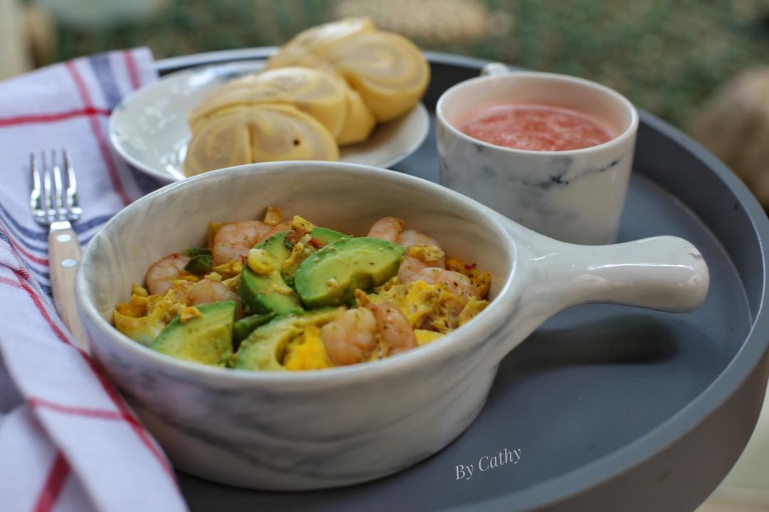 No .242 早餐打卡2017.11.05 “鲜虾牛油果杂蔬烘蛋”+“南瓜紫薯馒头”+“胡萝卜苹果...