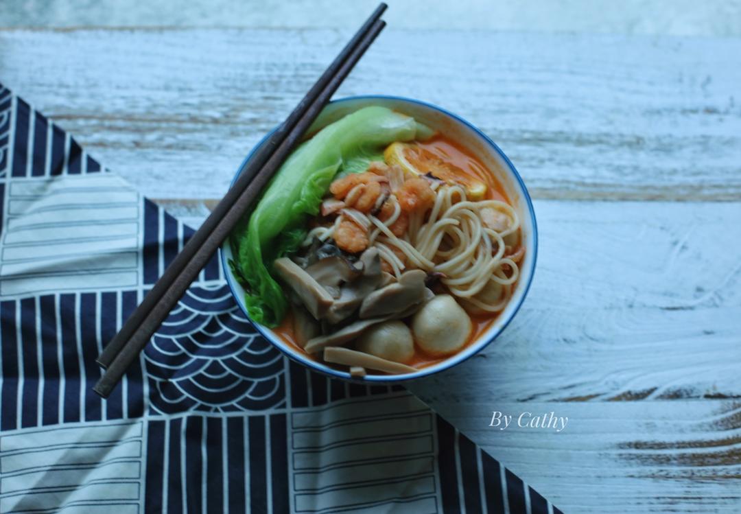 No .243 早餐打卡2017.11.06 “海鲜冬阴功拉面”+“夹心鱼丸”+生菜。