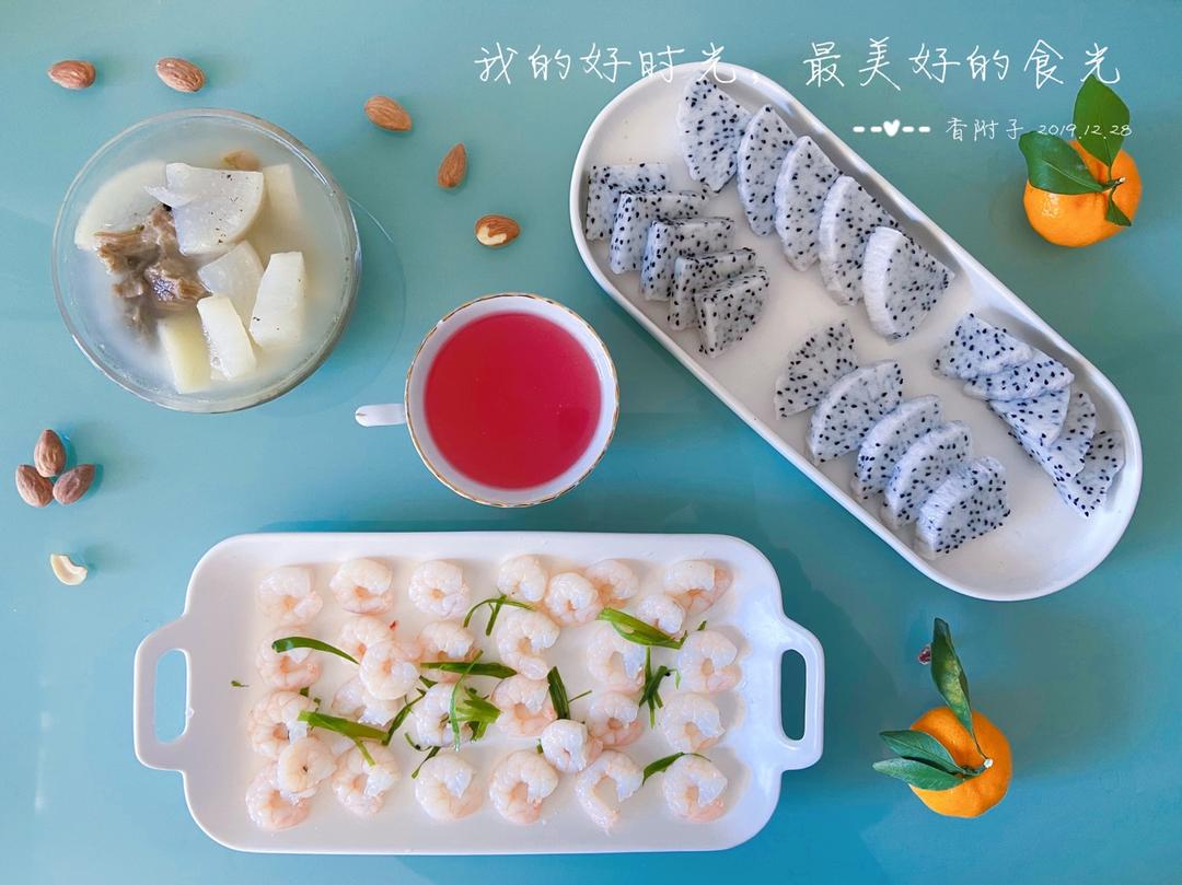 今日早餐:萝卜炖排骨+营养美学+火龙果+珍珠虾仁+橘子