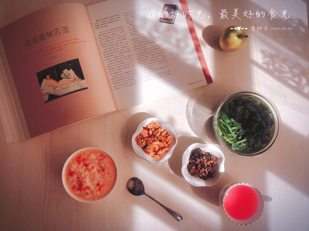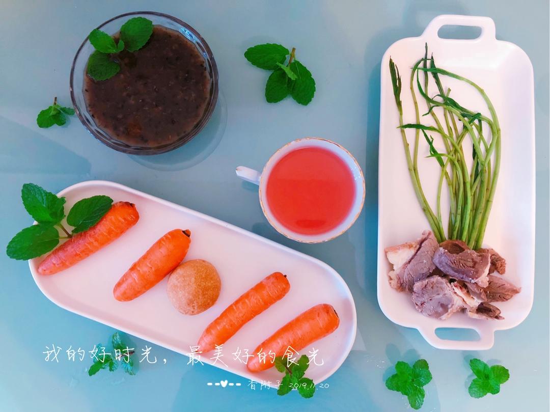 今日早餐:黑咕隆咚粥+营养美学+藜蒿+牛肉冷片+拇指胡萝卜+一小个火腿月饼