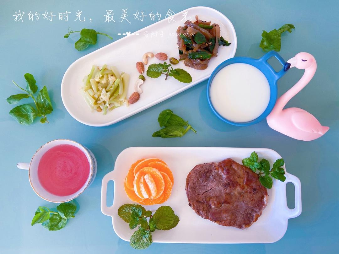 今日早餐:白灼花菜+坚果+烤韭菜魔芋+营养美学+橙子+牛排