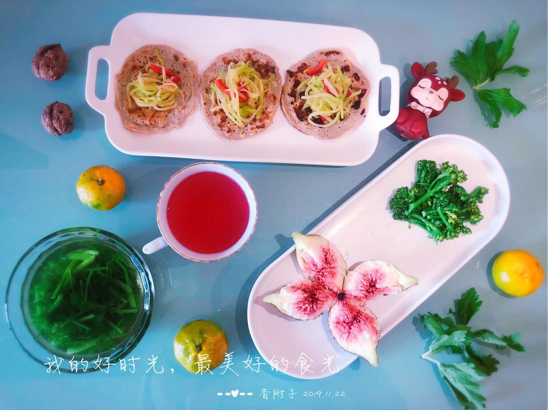 今日早餐:鸡蛋煎饼+茴香汤+营养美学+无花果+芥兰+橘子+核桃