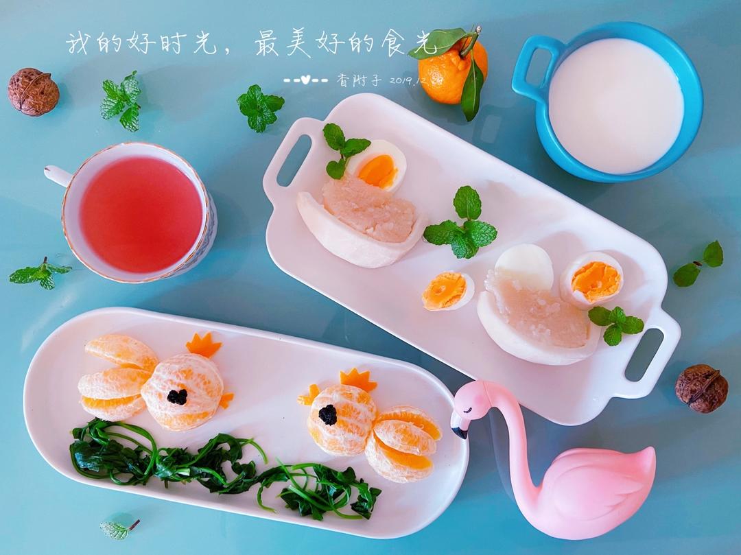 今日早餐:营养美学+椰子糯米饭+白煮蛋+牛奶+金鱼橘子+荠菜海藻