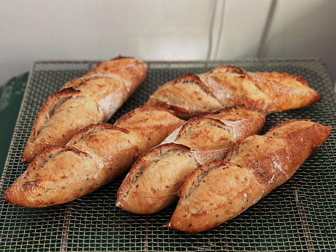 广坦配方小法棍,500克高筋面粉+325克水,9克盐和2克酵母,揉面后进冰箱冷藏过夜发酵;第二天取出回温1小时,切四分整...
