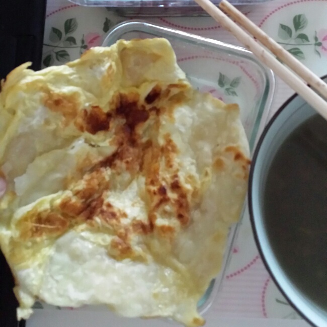 鸡蛋灌饼,卖相是差了点,也没有凉拌土豆丝或者海带可以卷着,胡乱拌了一些紫甘蓝充数