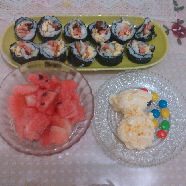 培根寿司+自制冰激凌+冰镇西瓜。