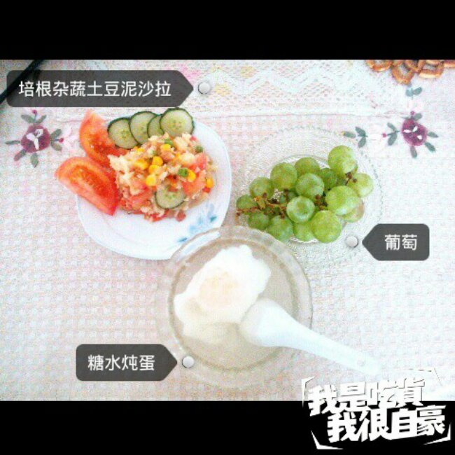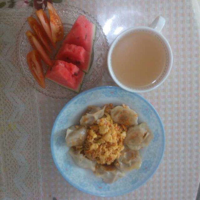 煎饺+炒蛋+银耳露+西瓜蕃茄拼盘。
