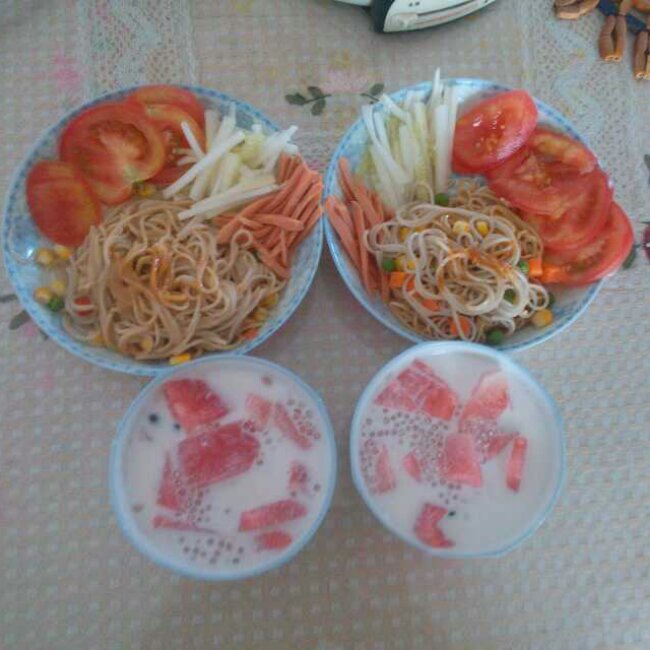 杂蔬花生酱拌面+西瓜鲜奶西米露。