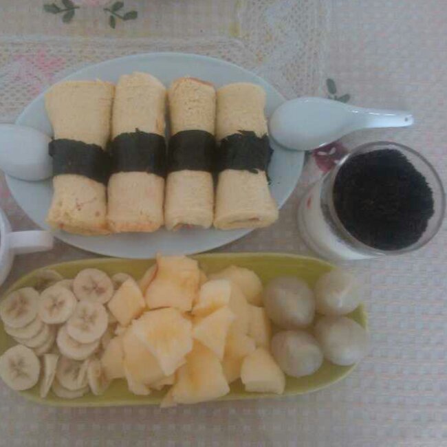杂蔬吐司紫菜卷+香蕉苹果荔枝拼盘+盆栽酸奶。