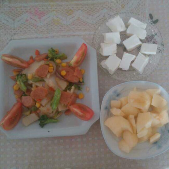 什锦炒年糕+椰奶冻+苹果切片。