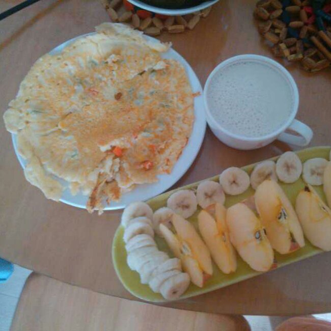 杂蔬牛奶鸡蛋饼+纯豆浆+香蕉苹果拼盘。