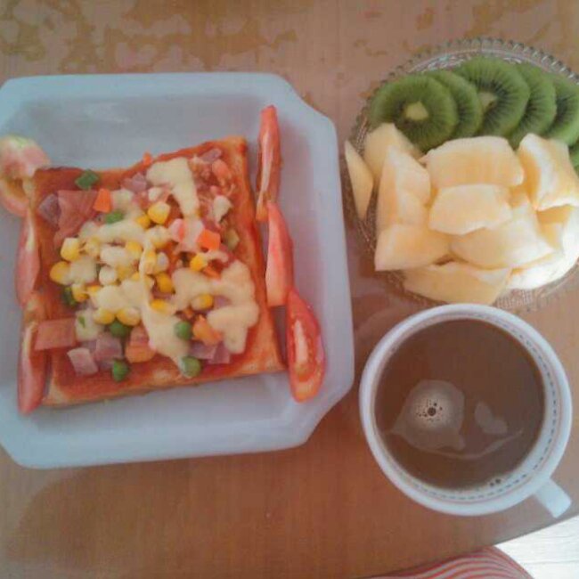 培根杂蔬吐司批萨+速溶咖啡+猕猴桃苹果拼盘。