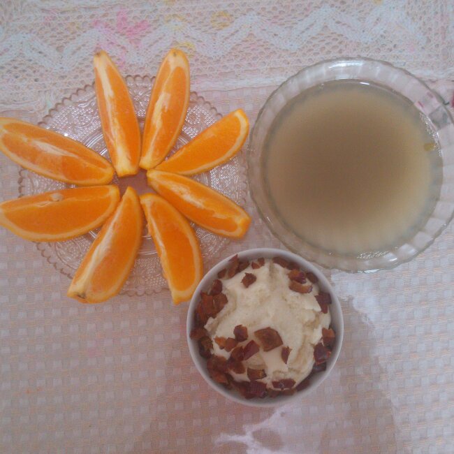 红枣蒸糕+绿豆汤+橙子切片。