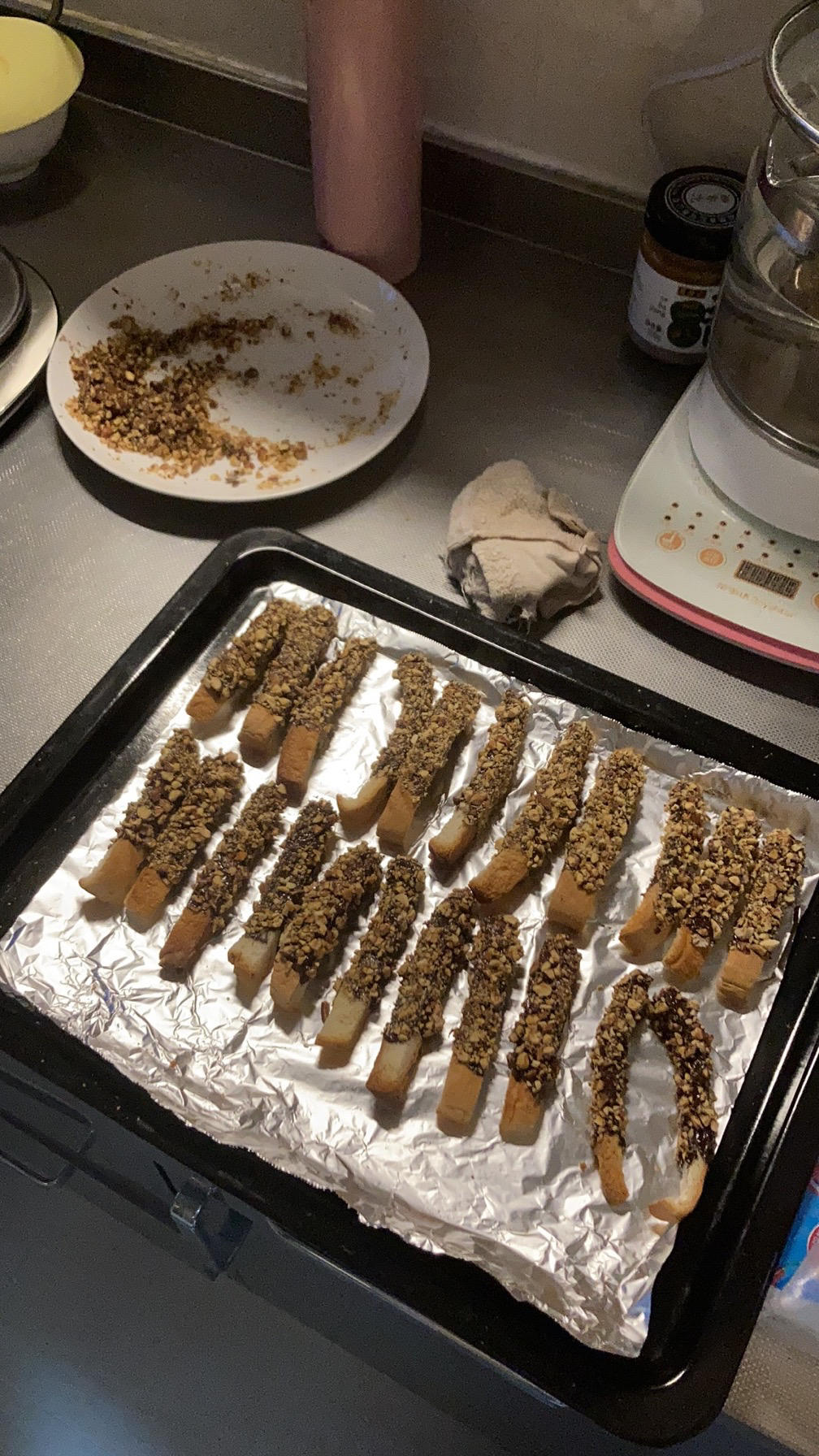 59根面包条,先170度烤了10分钟,中间还有点软不够脆,又175度烤了5分钟可以了。这次是榛子碎混了少量杏仁碎,用了1...