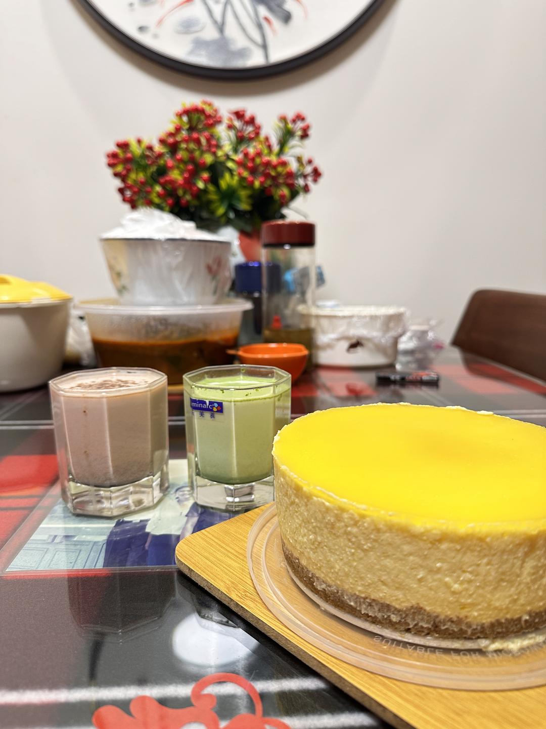 蛋糕糊中加了酸奶和奶油奶酪,酸酸甜甜很好吃,配上可可与抹茶牛奶,在家也可以享有甜品店的愉悦。