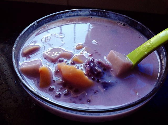 紫薯年糕芋头,配合牛奶与炼乳,但个人觉得250ML牛奶太腻了。。