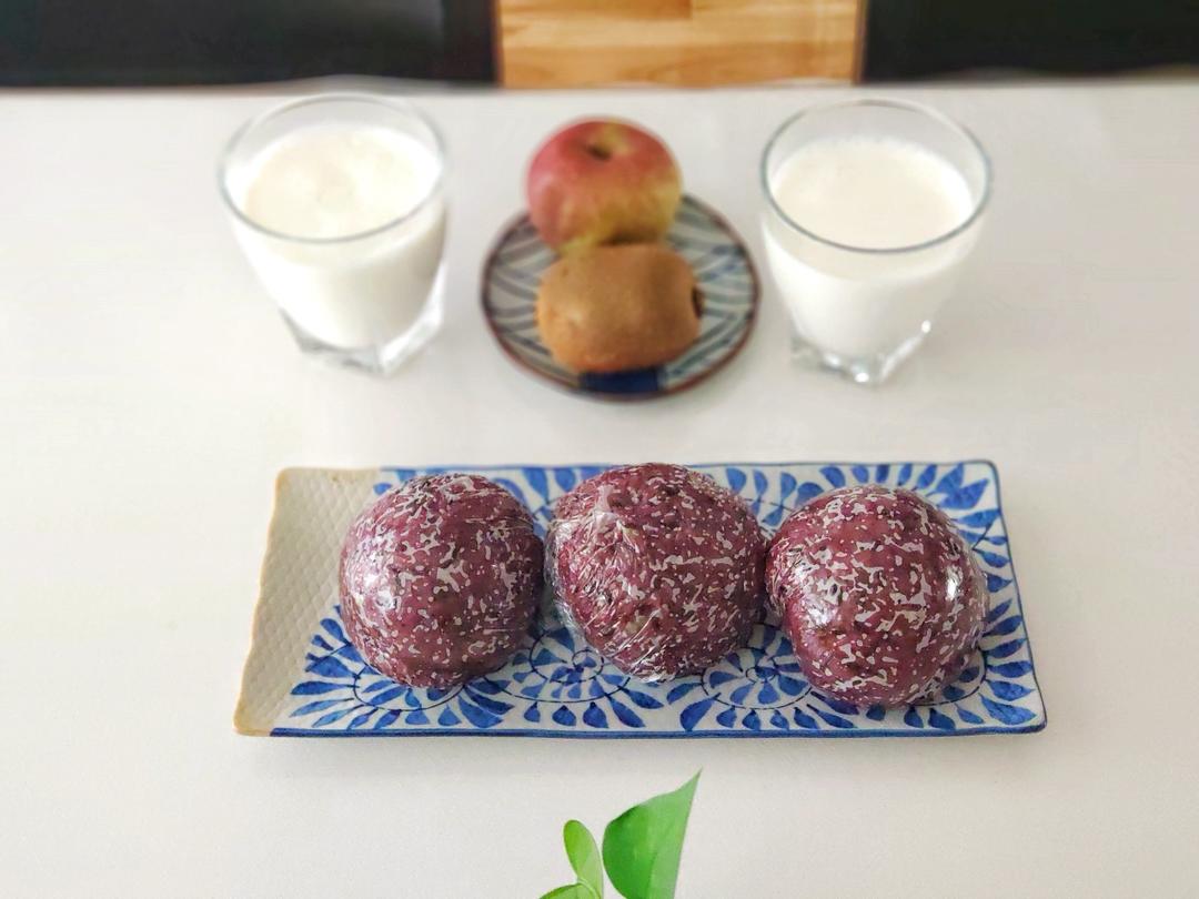 黑米饭团、牛奶、徐香猕猴桃、丑苹果。