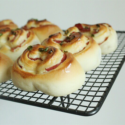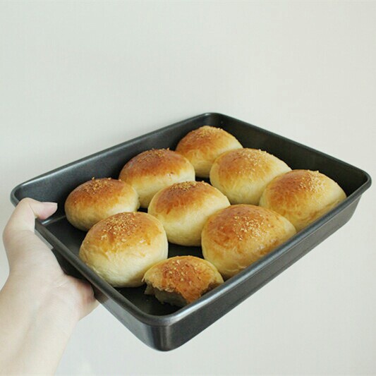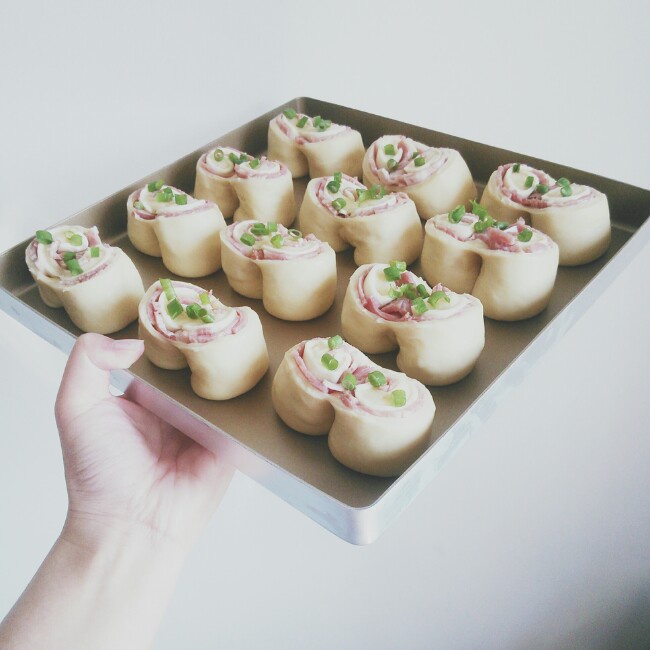 这个面包超级软妹!但是问题是,面团特别湿,我是手工揉面。。。揉的好心酸~另外,我的烤盘稍微大点,就做成一个一个的餐包了,...