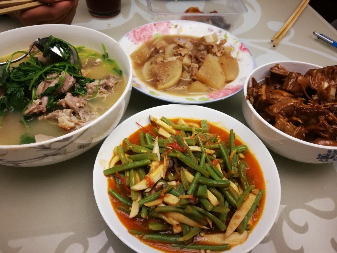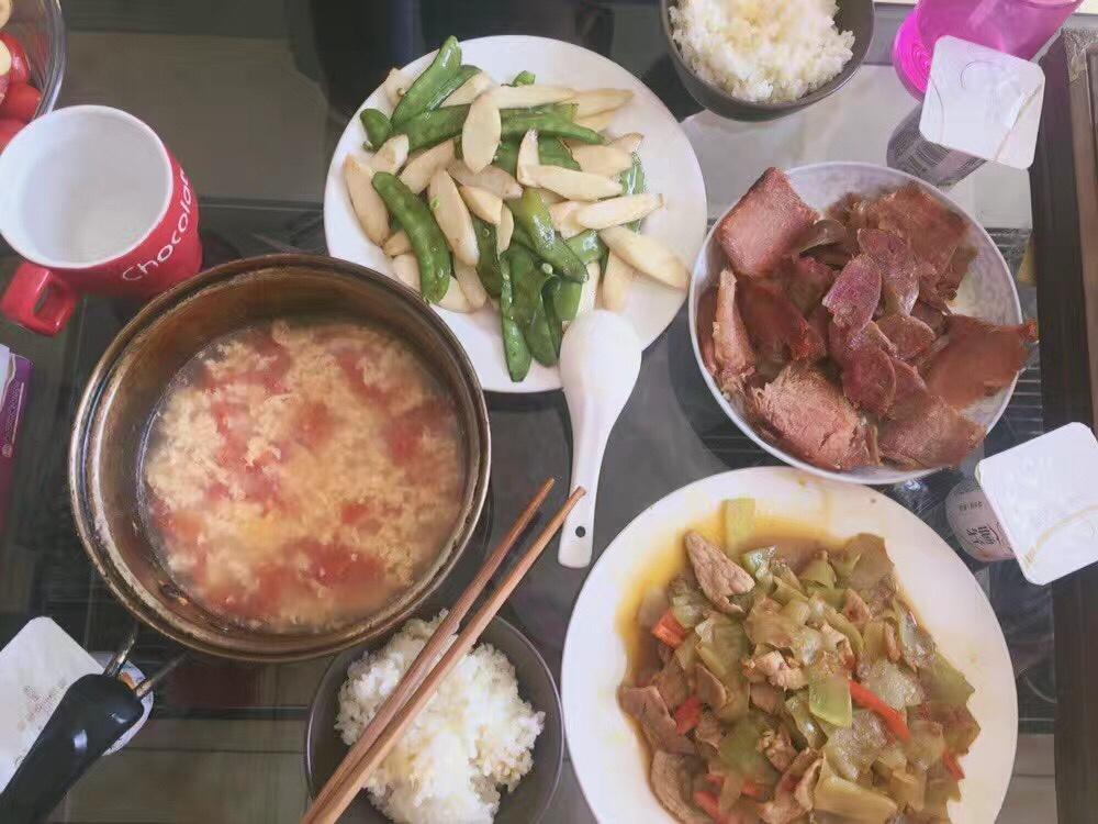 山药炒荷兰豆、秘制剁椒肉片炒莴笋、腊肉香肠、鸡蛋汤。最好吃的是秘制剁椒肉片炒莴笋,我妈妈特地从湖南寄到北京的,好多朋友想...