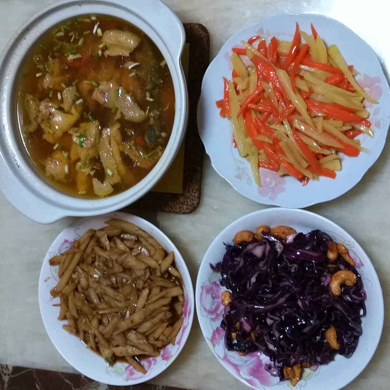糖醋耦丝,紫甘蓝拌腰果,土豆葫萝卜丝,参鸡汤