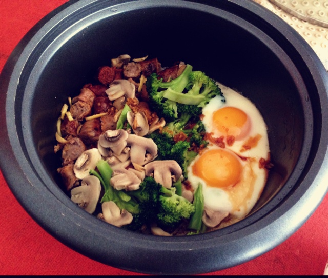 用电饭锅做的~好吃~米有点烂,莫非是泡太久了。没有腊肠用,用了香肠,先烤了烤,米熟了以后放进去饭里闷滴 #午餐•2014...