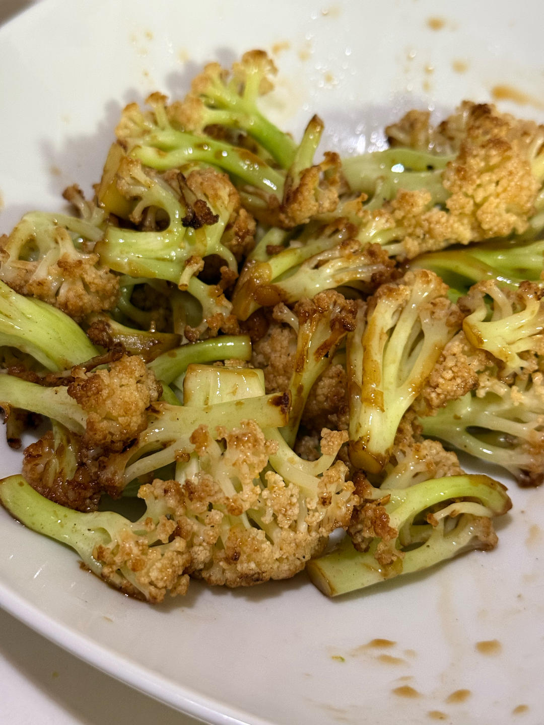 热油下花椒,然后清炒花菜,中途下生抽,出锅前加油,很好吃。