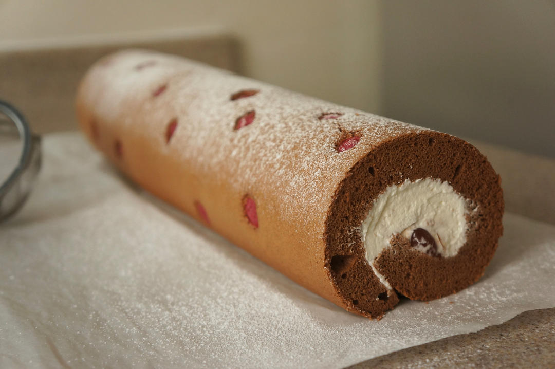 新年好呀!巧克力朗姆樱桃卷,表面撒点冷冻树莓和糖粉,烘托下节日气氛~