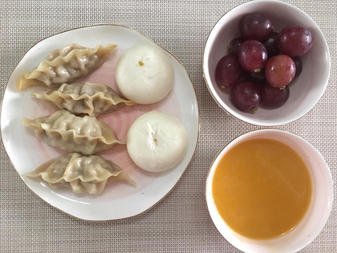 白菜猪肉馅蒸饺 流沙包 芒果西米露 红提