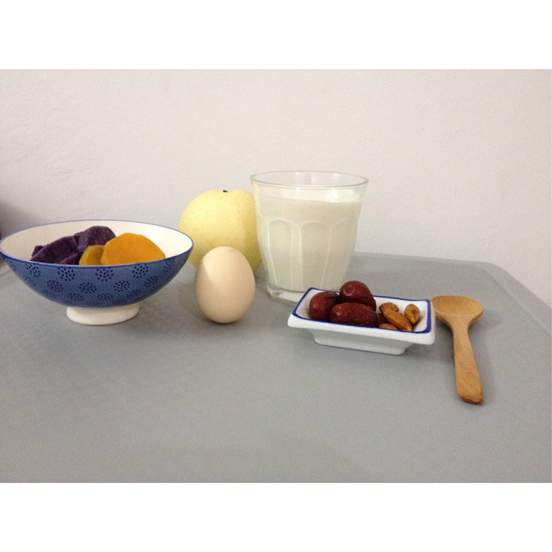 纯奶 蒸紫薯红薯 水煮蛋杏仁红枣 大梨子 加餐小冬枣和三黑豆浆