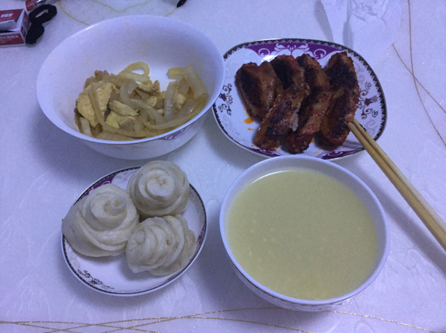 洋葱炒鸡蛋,电饼铛压鸡翅,玫瑰小花卷,小米粥。