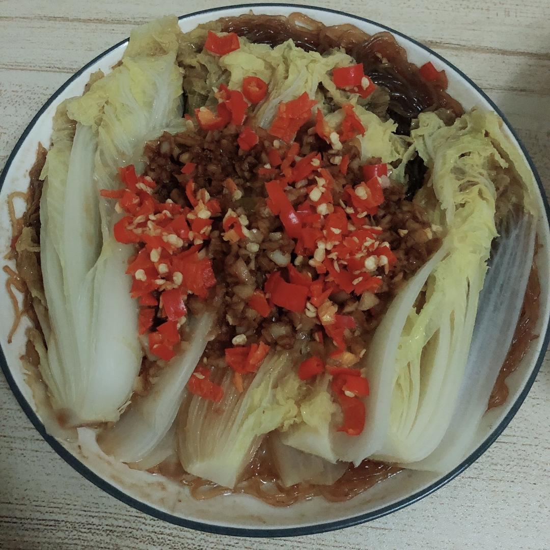 宝宝不舒服,没有出去买菜,用剩下的粉丝和仅有的娃娃菜蒸了这个,辣椒纯属点缀好看,完全不辣,宝宝吃了粉丝也吃了一些娃娃菜