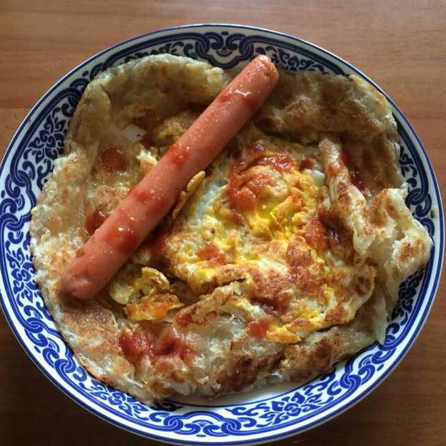 买的手抓饼,加鸡蛋和香肠,还有番茄酱,老公说好吃✌