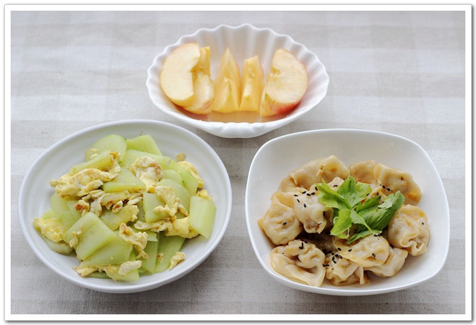 拌馄饨+黄瓜炒蛋+苹果