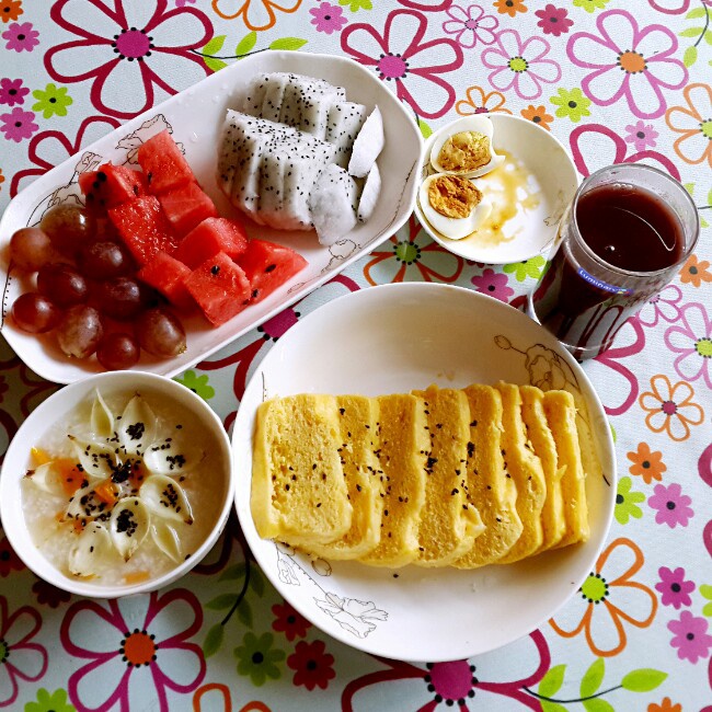 南瓜百合芝麻粥,黄馒头片,水果,鸡蛋,黑米汁...