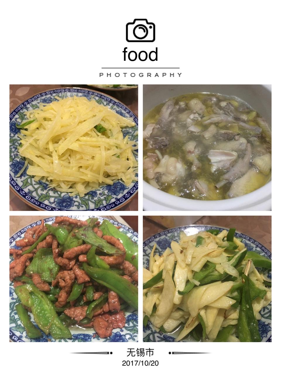 酸辣土豆丝,炖鸡汤,青椒牛柳,茭白炒青椒。