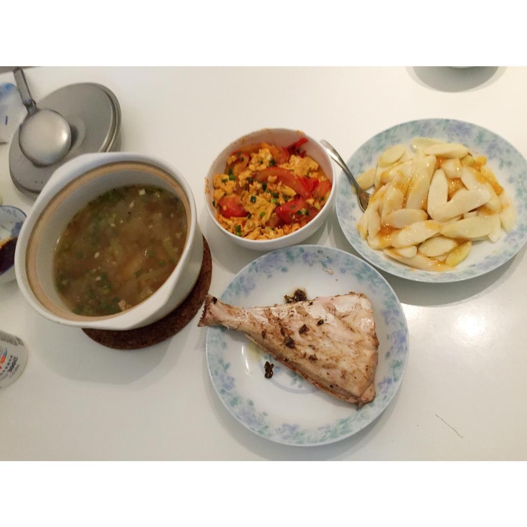 瑶柱冬瓜汤、番茄炒蛋、剥皮鱼、黄桃山药。爸爸从下班买菜到端上桌用了一个半小时,每个菜都好好吃。 #晚餐•2017年1月2...