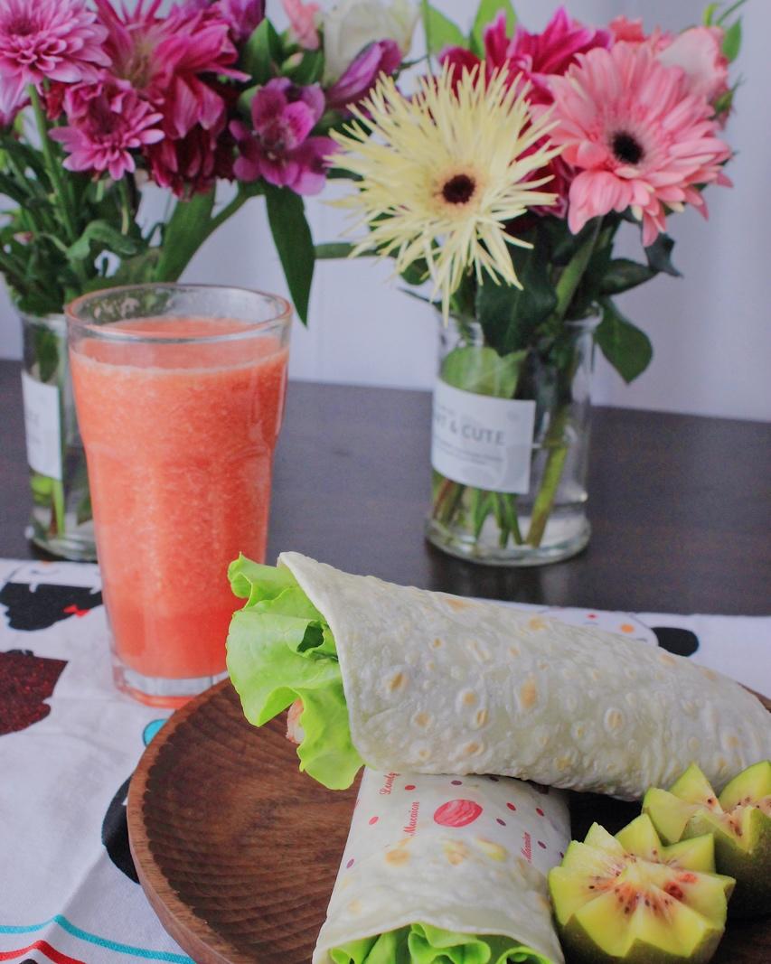 早安!牛油果鸡肉培根卷,西柚汁~~第一次做这种卷饼,做起来挺简单的,然后又美味,以后可以...