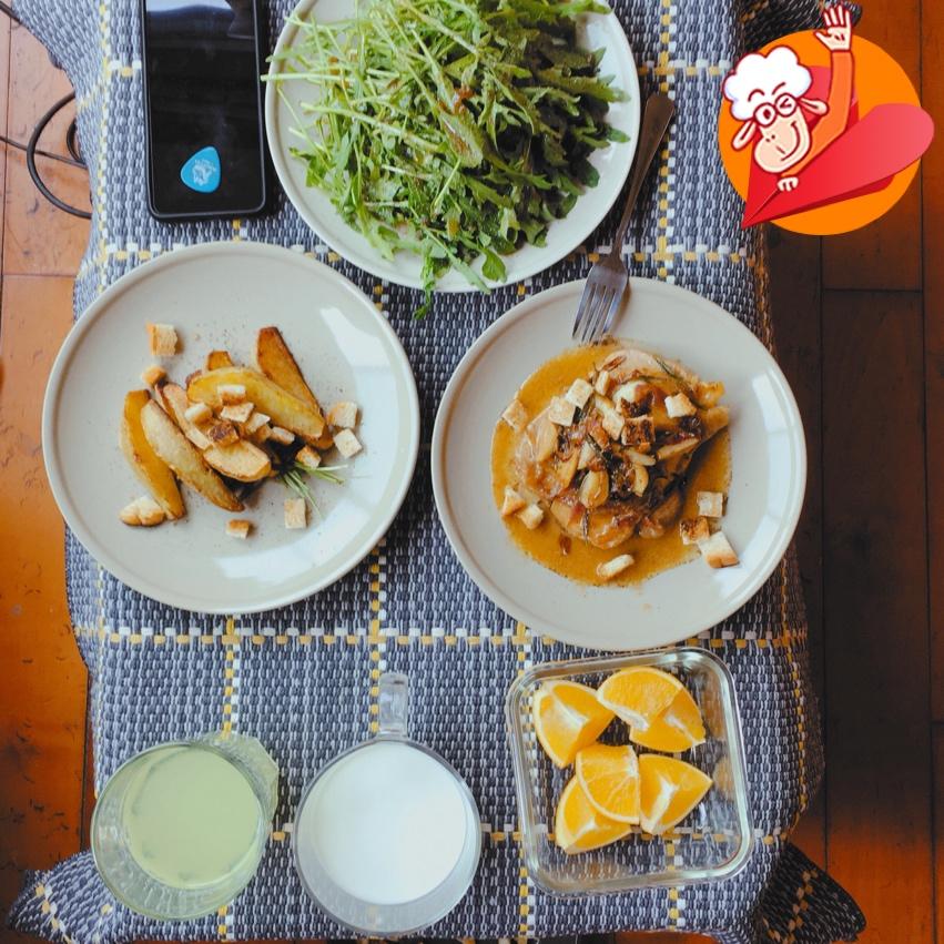 🌑煎鸡肉(用蒜和洋葱和香草加油煎了之后,又放了牛奶和西柚汁炖了一下,独家配方,巨香)