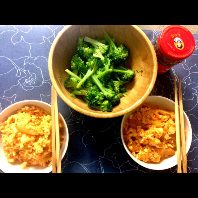 辣白菜蛋炒饭和水煮菜花~女神老干妈也上镜啦。(觉得蔬菜还是水煮或者清炒味道好一点。上次尝试了一个老干妈炒芹菜 难吃啊&g...