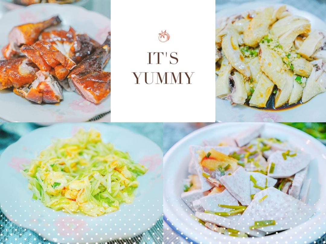 其实是昨天的菜肴,不过不知道为什么,昨天传不上来~片皮鸭、白斩鸡、韭菜黄炒蛋、荔浦芋头蒸咸肉~ #午餐•2018年8月2...