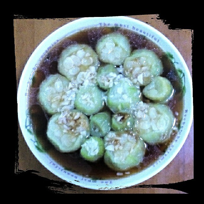 一个人晚餐,偷懒,一根丝瓜加少许油,放微波炉叮三分钟,淋上蒜泥生抽,快手!