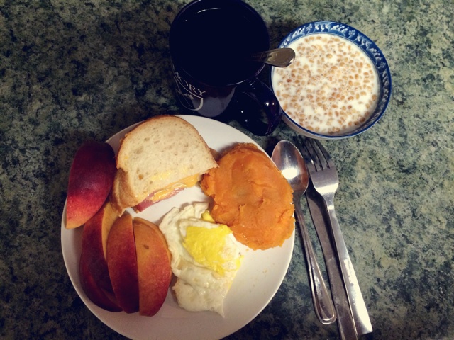 橙色早餐 火腿cheese牛油果三明治 煎蛋番薯泥桃子 牛奶泡谷物+咖啡