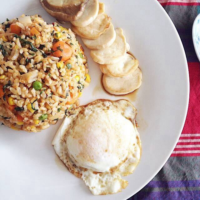 煎王子菇,煎鸡蛋,什锦炒饭里面放了辣白菜,炖了一晚上的老鸭汤没出镜^^