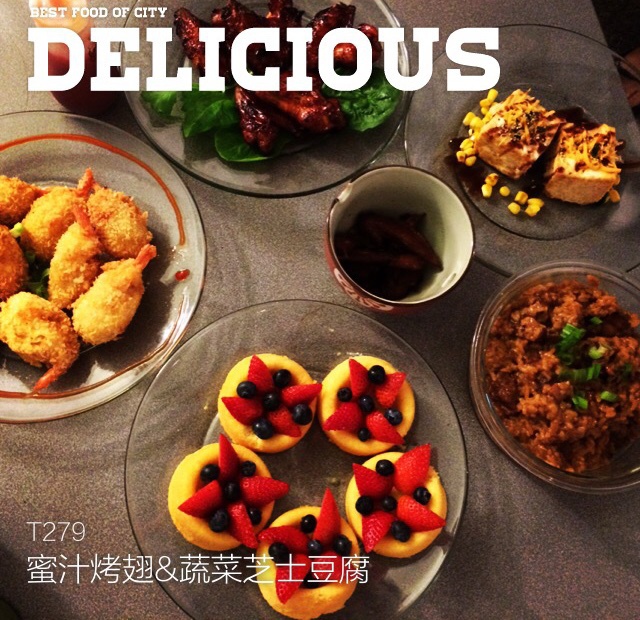 蜜汁烤鸡翅&考蔬菜芝士豆腐&排骨焖饭&卤翅尖&水果挞