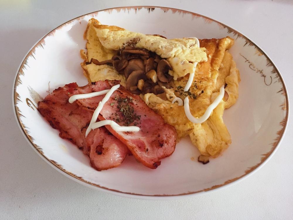 早安!培根口蘑蛋卷,蛋饼松软,口蘑与黑胡椒、罗勒碎简直是天生搭档~