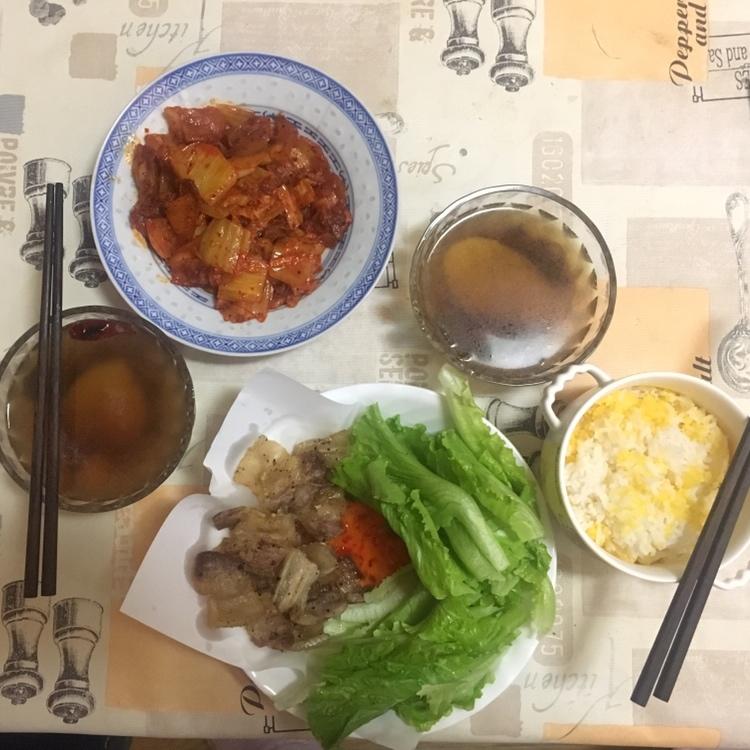 彝族酸菜土豆汤、韩式泡菜五花肉、生菜包香煎五花肉(配泰式酸辣酱)、玉米饭,酸菜汤我还可以再...