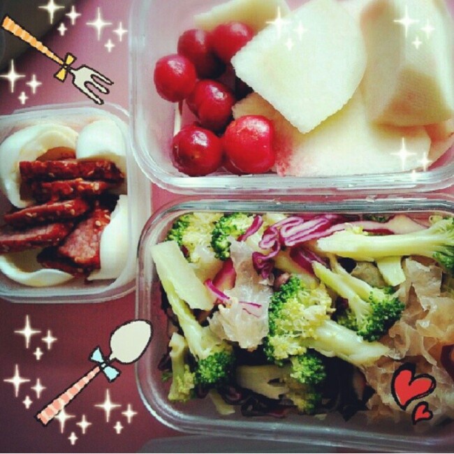 蛋白,香辣牛里脊,櫻桃,桃子,銀耳,紫甘藍,西蘭花