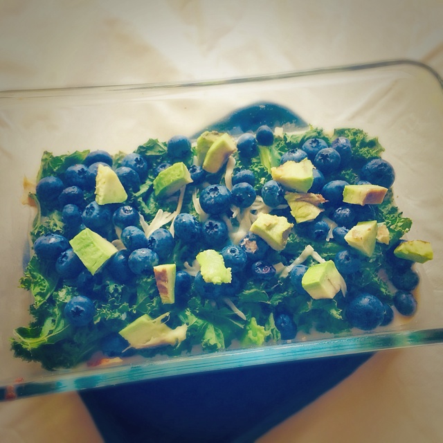 没有按照菜谱来,所以失败无可厚非。用的燕麦麸和杏仁奶打底,蔬菜是西兰花和Kale,加脱脂火鸡胸肉和脱脂马苏里拉。蓝莓和牛...
